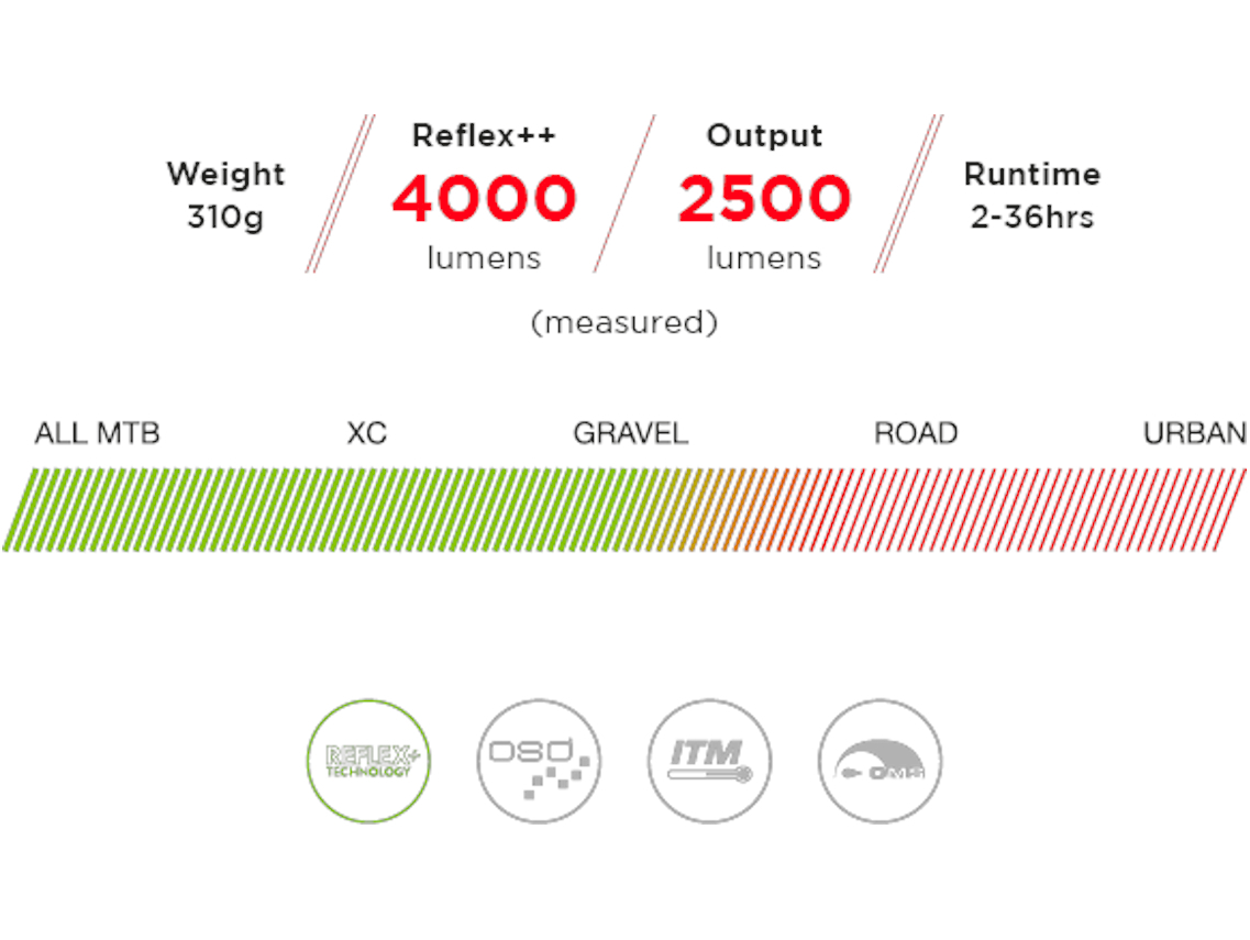 Concentrate on the ride – Reflex automatically adjusts the light to provide boosted output when riding hard and fast then intuitively dimming for the slower sections such as climbs. This is all to optimise battery capacity, to provide extra light when needed and save it when not required.